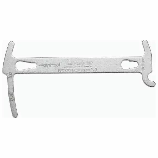 Cet outil dispose d’un contrôle d’usure de 75% à 100%. De plus, il est équipé de 2 crochets pour maintenir la chaîne libre lors d’un changement de maillon, d’un outil pour démonter une valve et des clés hexagonales de 5/6 et 8 mm.