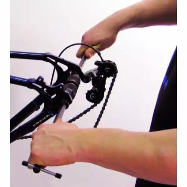 Concrètement, après avoir enlever la roue et insérer l’outil dans le cadre, cet outil garantit un alignement de la fourche arrière pour atteindre le parallélisme parfait.