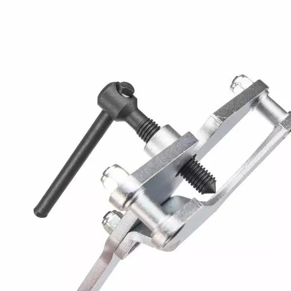 Avec cet outil, vous pouvez saisir fermement le pignon en entier, des deux côtés, le tourner et le réparer. Son axe et ses bagues de côté créent une forte prise. En tournant l’outil en sens inverse des aiguilles d’une montre vous pouvez dévisser le pignon.
